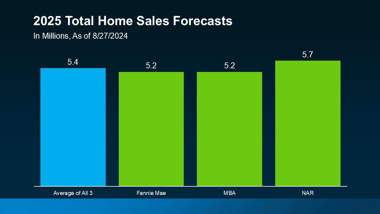 According to Fannie Mae, MBA, and NAR, total home sales are forecast to climb slightly, with an average of about 5.4 million homes expected to sell in 2025 (see graph below):